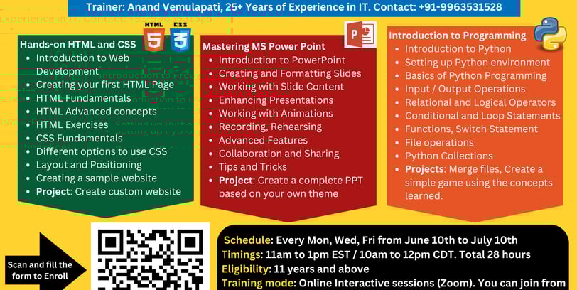 This workshop covers 3 subjects - HTML & CSS for web development, MS PowerPoint for presentations, and Python for Programming skills. No technical background is required. You will learn all the skills in one month, instead of spending 9 to 12 months with online self-learning resources. Even if you are aware of some concepts, we are sure there is enough for you to learn. All our workshops are interactive, short & sweet in helping you achieve the required skills quickly and with confidence.